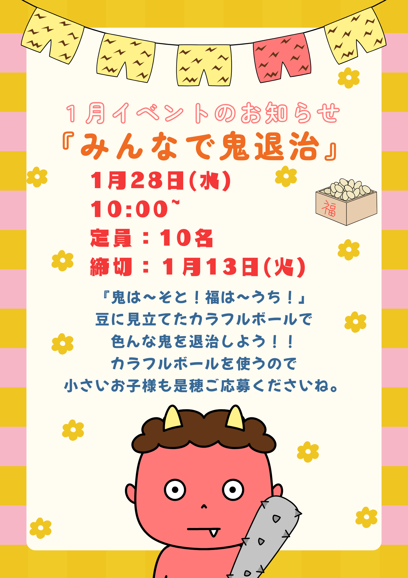 | 2025.12.27 | ・1月の秀和だより(1月予定表)を更新しました。 来館の際は、事前に予定の確認をお願いします。 インスタグラムでも予定表の確認ができます。 12/26(金)~1/5(月)は終日休館とさせて頂きます。 ・1月の講習会のお知らせ 1月21日(木)10時~ 『出張Lii親子で楽しくからだを動かそう』 講習会は1/9(金)の12:00まで申込を受付しています。 ・1月のイベントのお知らせ 1月28日(金)10時~ 『みんなで鬼退治』 イベントは1/19(月)の12:00まで抽選で申込を受付しています。 参加希望の方は、電話もしくはスタッフに直接申し込みをお願いします。 抽選結果はインスタグラムで発表します。 (インスタグラムはこちらを押して下さい) ・1月のお誕生日会のお知らせ 1月30日(金)10時~11時 |