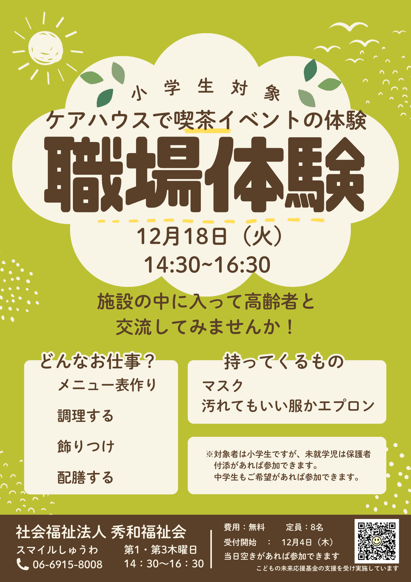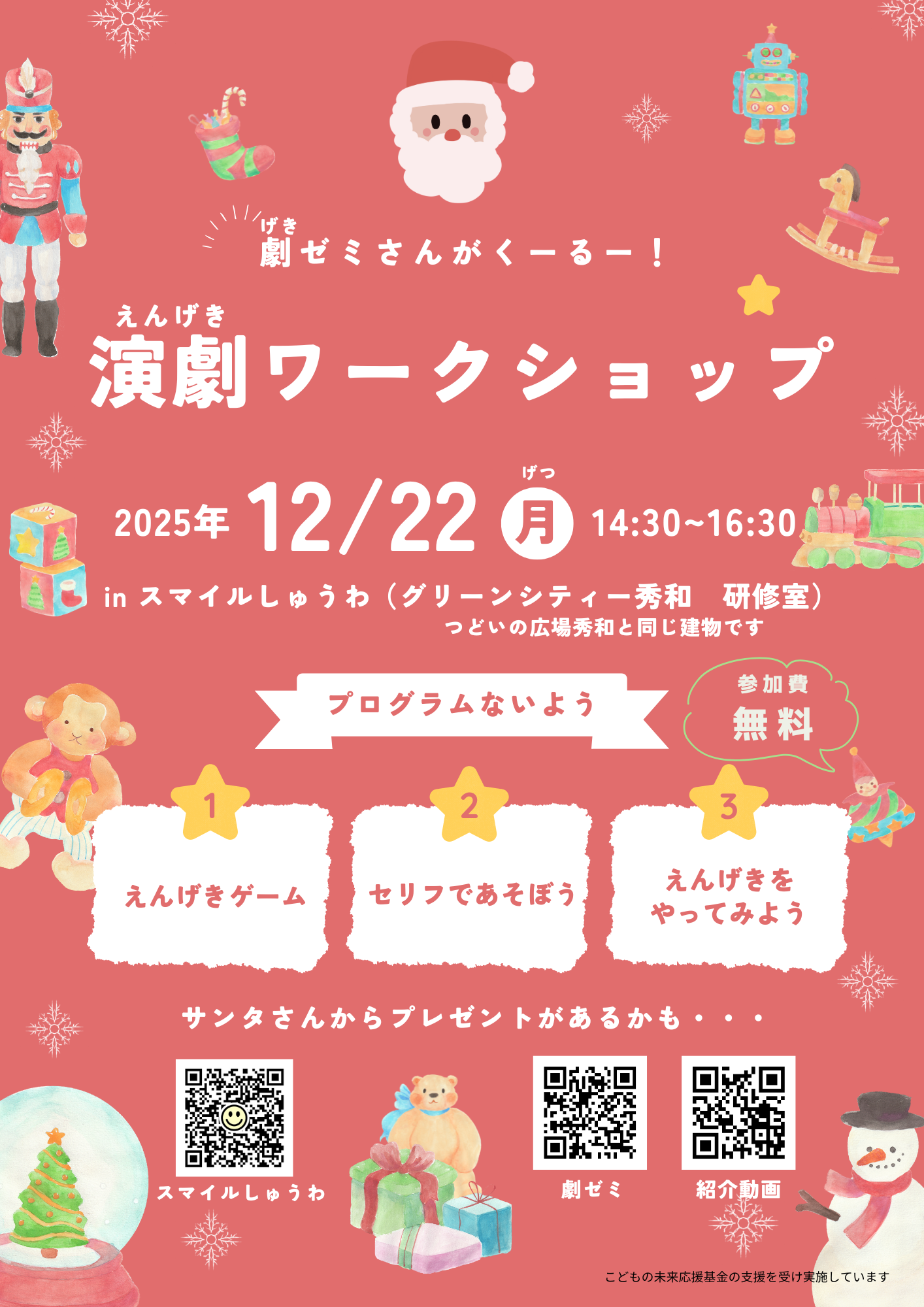 | 2025.11.26 | ・スマイルしゅうわ開設のお知らせ 12/4 (木) 14:30~16:30 ※職場体験の受付開始 12/18(木) 14:30~16:30 職場体験 (参加費無料) 職場体験について、こども達は高齢者施設に入る機会があまりないと思います。 今回の職場体験は難しいせず、高齢者施設ではどんな事をしているのか知ってもらい、イベントを楽しんでもらえたらと考えています。 年齢制限はありませんが、未就学児は保護者の付添をお願いします。 小学生であればこどもだけで参加も可能ですが、保護者の方も一緒に参加して頂く事も可能です。楽しんでいる様子を見たり、写真にしてはいかがでしょうか。 興味のある方はスタッフまで声を掛けて下さい。 12/22 (月) 14:30~16:30 演劇ワークショップ (参加費無料) ※劇ゼミさんと一緒にイベントを開催します 年齢制限はありませんが、未就学児は保護者の付添をお願いします。 グリーンシティー秀和の正面自動ドアから入って来て下さい。 予約不要、利用料金もかかりません。 友達と遊べるよう部屋を開放しています。 |