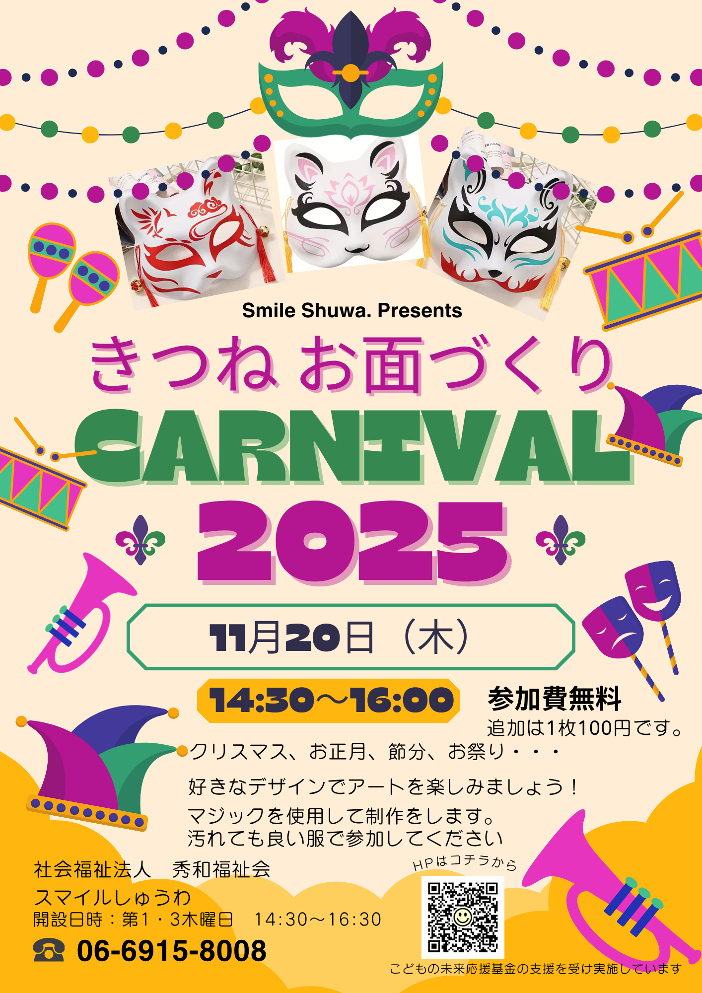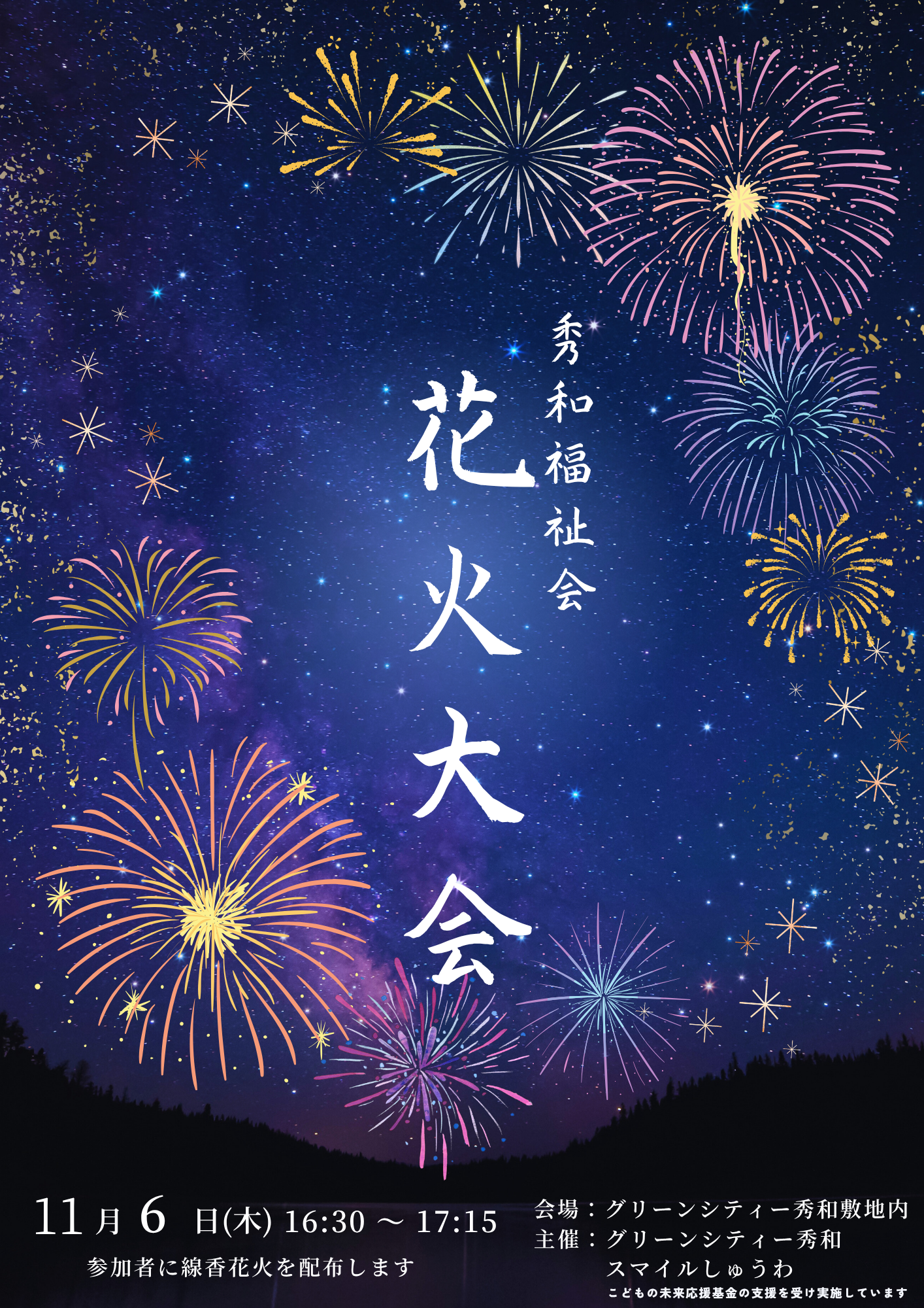 | 2025.11.2 | ・スマイルしゅうわ開設のお知らせ 11/6 (木) 14:30~16:30 ※線香花火大会は16:30~17:15 11/20(木) 14:30~16:30 お面作りイベント グリーンシティー秀和の正面自動ドアから入って来て下さい。 予約不要、利用料金もかかりません。 友達と遊べるよう部屋を開放しています。 |