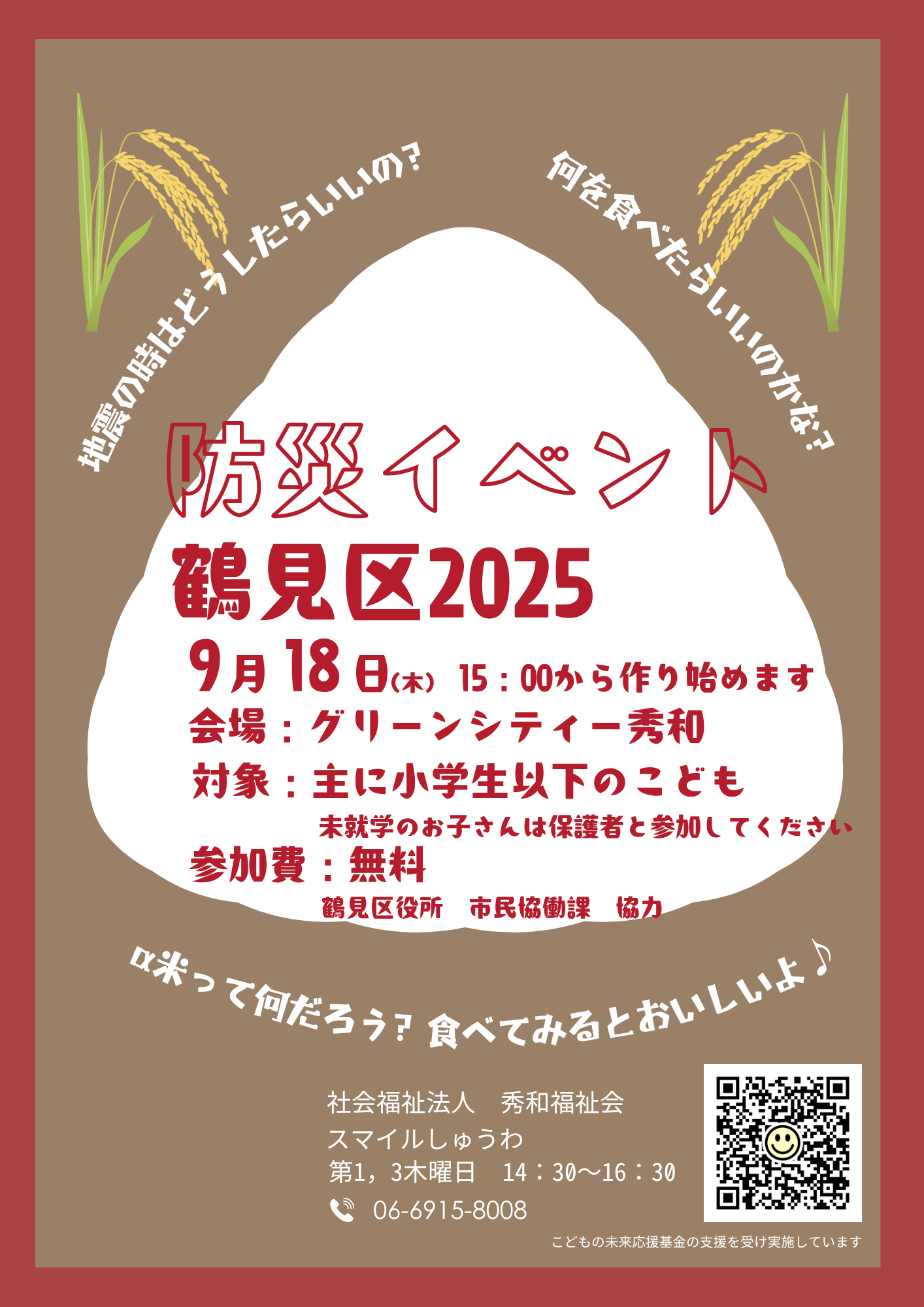2025.8.29 | ・スマイルしゅうわ開設のお知らせ 9/4 (木) 14:30~16:30 ぷよぷよすくい 9/18(木) 14:30~16:30 防災イベント グリーンシティー秀和の正面自動ドアから入って来て下さい。 予約不要、利用料金もかかりません。 友達と遊べるよう部屋(研修室)を開放しています。 ・9/4は、ぷよぷよすくいを予定しています。 ・9/18は、15:00から防災イベント(α米作り)を予定しています。 α米でおにぎりを作って試食してもらう予定です。 ※鶴見区役所の職員さんも参加してくださいます! |